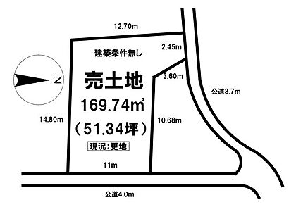 | 土地面積/坪(坪単価) | 169.74m2(登記簿)/51.44坪(1.90万円) | 代表的な接道 | 公道 東 4m ※詳細は備考欄をご確認ください |
