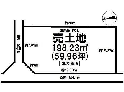 | 土地面積/坪(坪単価) | 198.23m2(登記簿)/60.07坪(3.30万円) | 代表的な接道 | 角地 公道 北 4.5m、西 6.1m ※詳細は備考欄をご確認ください |