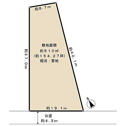 | 土地面積/坪(坪単価) | 510.00m2(登記簿)/154.55坪(16.00万円) | 代表的な接道 | 一方 公道 南西 4.3m ※詳細は備考欄をご確認ください |