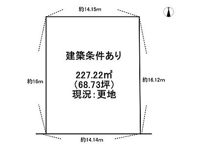 | 土地面積/坪(坪単価) | 227.22m2(登記簿)/68.85坪(12.00万円) | 代表的な接道 | 公道 南 4.5m ※詳細は備考欄をご確認ください |