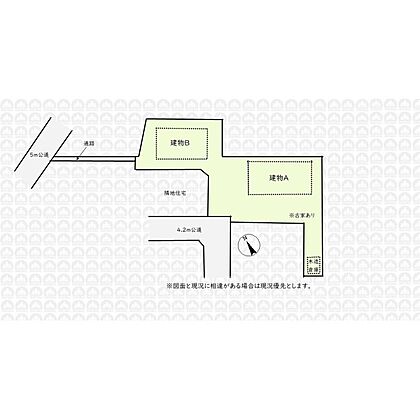 【接道】 一方 ( 公道 南西 4.2m ) 共有通路持分2.91m2あり/地目の一部が畑のため農地法5条の届出要/上物有(建物A:木造・昭和56年築・建物面積146.15m2/建物B:木造・昭和56年築・建物面積82.80m2)/木造倉庫あり/景観法/法22条区域/航空法 |