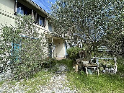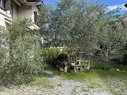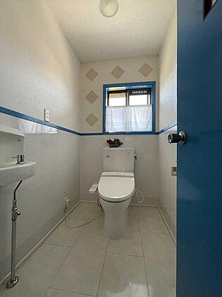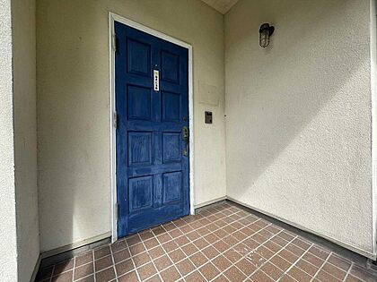玄関ドアは木製のアンティーク調で青い色が印象的。