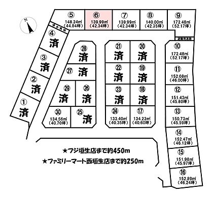 【接道】 一方 ( 公道 南 5.3m ) ■フジ垣生店まで約450m■ファミリーマート西垣生店まで約250m■くすりのレデイ垣生店まで約500m■DCM垣生店まで約450m■大新田公園まで約90m 建築条件付き (建築条件付きとは) |