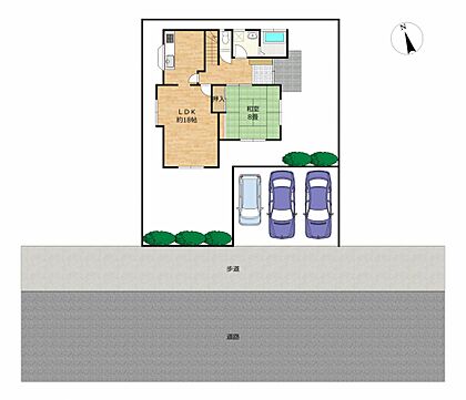 前面道路は幅員約12m(6m+歩道3m×2)、敷地の南西側が接しています。交通量は少ないので小さなお子様がいるご家族様にも安心ですね。
