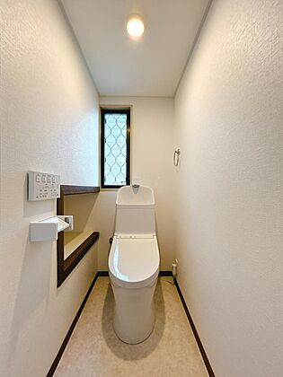(リフォーム済)トイレはTOTO製の温水洗浄機能付きに新品交換しました。表面は凹凸がないため汚れが付きにくく、継ぎ目のない形状でお手入れが簡単です。節水機能付きなのでお財布にも優しいですね。