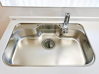 (リフォーム済)新品交換したキッチンのシンクはサビにくく熱に強いステンレス製です。水はねの音を抑える静音設計で、従来よりもさらに水音が静かになっています。