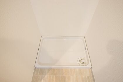 ランドリースペースは広さもたっぷり。タオルなどをしまえる収納棚もあります。