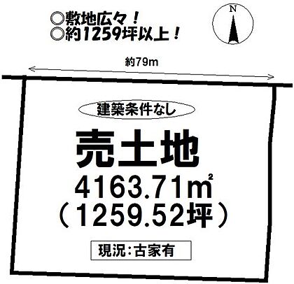 | 土地面積/坪(坪単価) | 4,163.71m2(登記簿)/1261.73坪(3.60万円) | 代表的な接道 | 公道 北 3.1m ※詳細は備考欄をご確認ください |