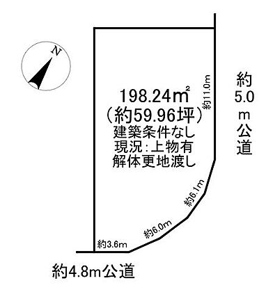 | 土地面積/坪(坪単価) | 198.24m2(登記簿)/60.07坪(13.20万円) | 代表的な接道 | 角地 公道 南東 4.8m、北東 5m ※詳細は備考欄をご確認ください |