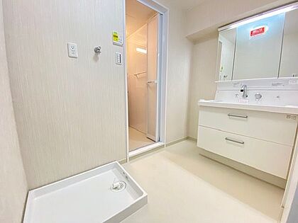 3面鏡仕様の洗面台。鏡の裏が収納になっていて小物がスッキリ片付きます。忙しい朝に嬉しいシャワー付♪お子様と並んで朝の身支度ができます♪広めの洗面所です。