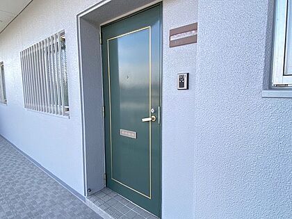 ご家族、お客さまを迎え入れるグリーンの落ち着いた色合いの玄関扉。セキュリティー対策として使えるモニタ付きインターホンが付いています。
