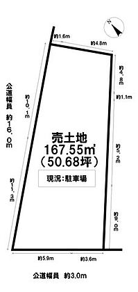 北側(公道)幅 約16.0m 間口 約21.40mあります。前面道路はきれいに舗装されています。