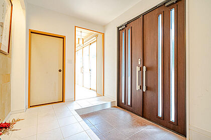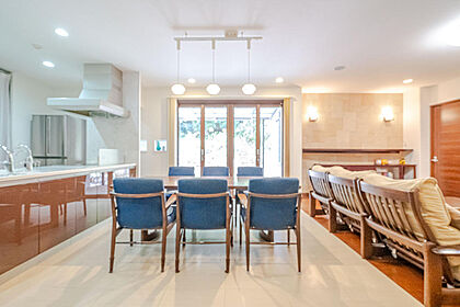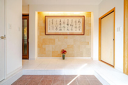 【接道】 一方 ( 公道 南東 ) ロータリーになっているアプローチの先に、ダイナミックさと洗練されたディテールデザインを併せ持つ家。敷地の特性を考え、オーナーのこだわりが詰まった住まい。 大きな玄関扉を開ければ、床一面に張り詰められた大理石と、間接照明の柔らかな明かりで照らされたエントランスに目を奪われる。また、和室の雪見障子から見える景色は、まるで旅館にいるような、大らかな気持ちになる。 |