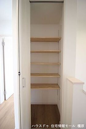 2階廊下にも収納を確保。可動式の棚はレイアウトを自由に変更できます。