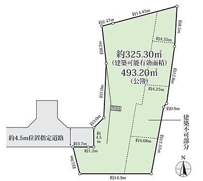 | 土地面積/坪(坪単価) | 493.20m2(登記簿)/149.45坪(15.70万円) | 代表的な接道 | 一方 私道 西 4.5m ※詳細は備考欄をご確認ください |