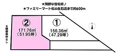 【接道】 一方 ( 東 ) ■ファミリーマート松山生石店まで約600m■ドラッグセイムス松山南吉田店まで約750m■南吉田中央公園まで約450m |