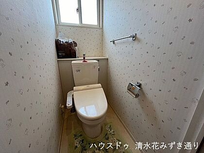 1Fトイレ・・・各階ひとつずつ完備◎可愛らしいアクセントクロスがポイントでトイレもひとつのお気に入り空間に♪小窓がついているので換気や採光はもちろん、圧迫感がなく快適にお使いいただけます!