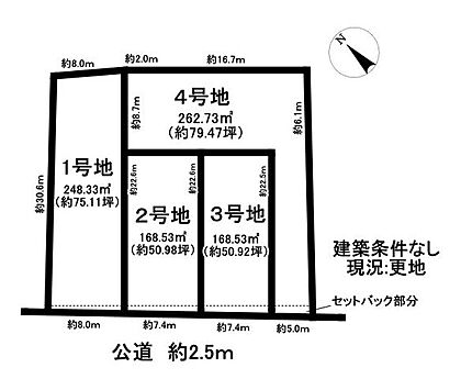 | 土地面積/坪(坪単価) | 262.73m2(登記簿)/79.62坪(11.30万円) | 代表的な接道 | 公道 南 2.5m ※詳細は備考欄をご確認ください |