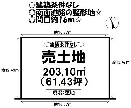 | 土地面積/坪(坪単価) | 203.10m2(登記簿)/61.55坪(12.80万円) | 代表的な接道 | 公道 南 6m ※詳細は備考欄をご確認ください |