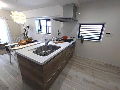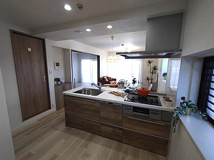 木目の対面システムキッチン(新品交換済)