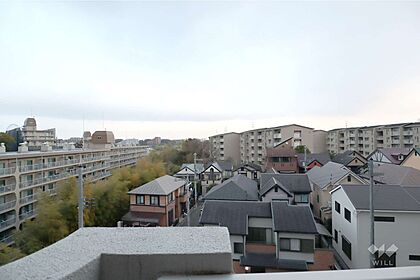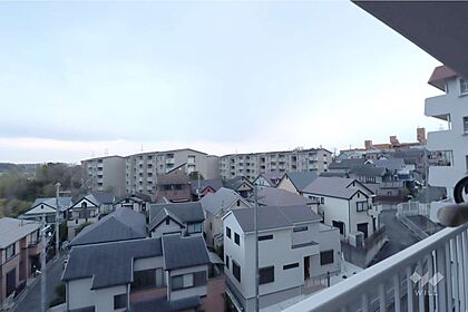 バルコニーからの眺め。前面に建物がないため日当たり・通風良好です。人通りや車通りも少なく、外からの目線も気になりません。