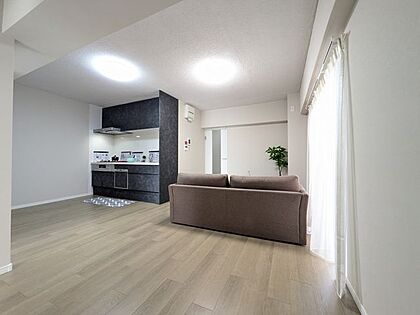 バルコニーから光が差し込むリビングです。暖かい空間で家族団らんをお楽しみください。