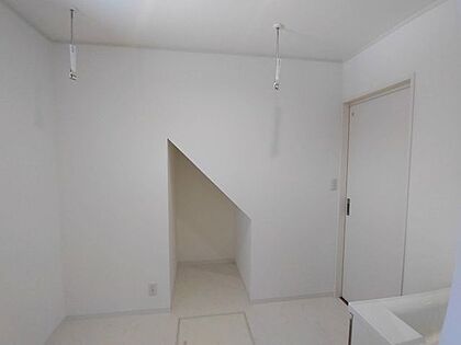 階段下を収納スペースとして活用しています!リネン類の置き場としても便利♪天井は物干し竿を掛けられる仕様になっており、室内物干し場としても活躍してくれます!