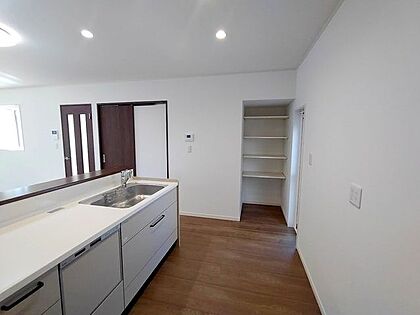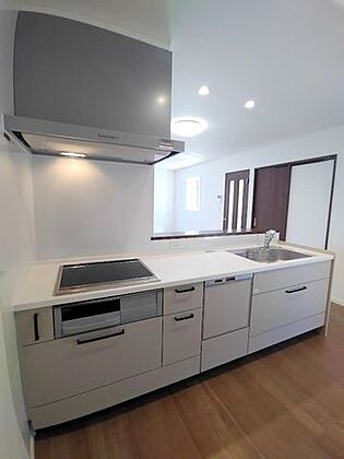 清潔感のある色合いのシステムキッチン♪収納スペースもたっぷりです!食洗機付きで家事の負担を減らして家族団らんの時間を増やせます♪