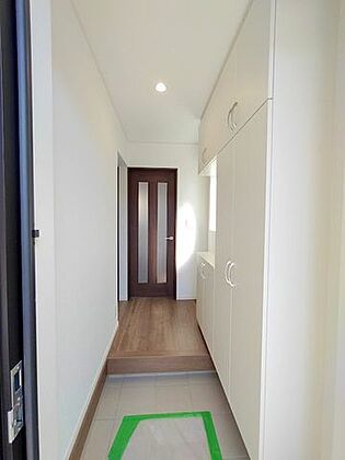 光の差し込む明るい玄関には、天井まであるコの字型のシューズボックスがあり、すっきり片付きます。ディスプレイスペースには家族の想い出の品を飾っておけますよ。
