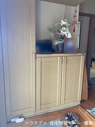 40足程度入るシューズボックスを設置。散らかりがちな場所の整理に役立ちます。
