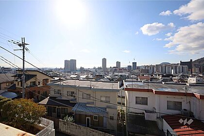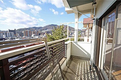 バルコニーからの眺め(南西方向)、目の前に遮るものがなく、日当りが良好なので、洗濯物がよく乾きます。日光浴や家庭菜園も楽しめるかもしれません。