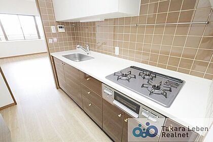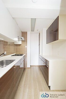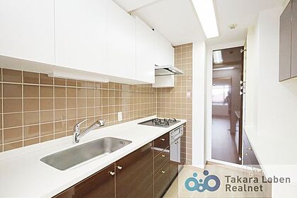 限られた空間を効率よく利用できるキッチンレイアウト。横移動だけで全てが完結するので、忙しい方の味方です。調理の飛び跳ねがリビングにまで響かないのも嬉しいですね。