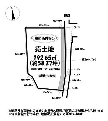 | 土地面積/坪(坪単価) | 192.65m2(実測)/58.38坪(19.90万円) | 代表的な接道 | 公道 東 1.1m ※詳細は備考欄をご確認ください |