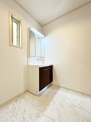 大きく見やすい三面鏡で清潔感ある洗面台は、身だしなみチェックや肌のお手入れに最適です。