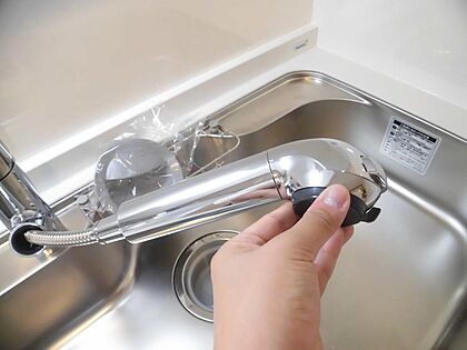 【同仕様写真/キッチン】新品交換したキッチンの水栓金具はノズルが伸びてシンクのお手入れもラクラクです。水栓本体には浄水機能が内蔵されていて、おいしいお水をつくります。