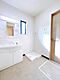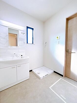 【リフォーム済・即入居可】洗面所です。新品の洗面化粧台洗面家設置、洗濯機用防水パンを設置しました。床はトイレ同様のクッションフロアです。