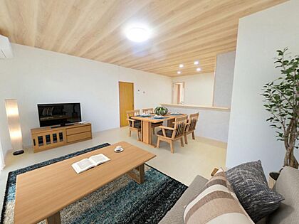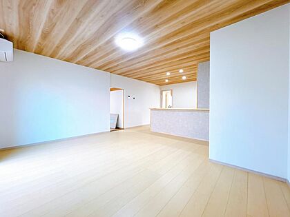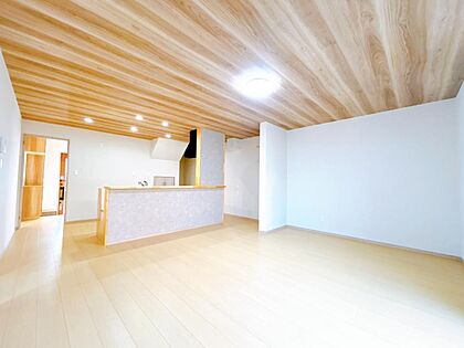 【リフォーム済・即入居可】リビング別アングルです。天井の木目クロスがアクセントでかっこよく仕上がっています。