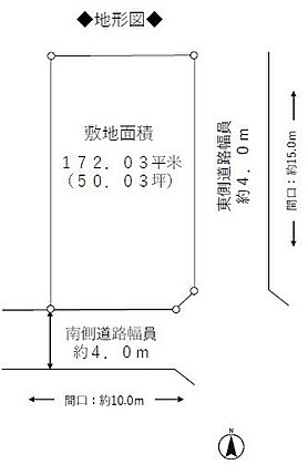 | 土地面積/坪(坪単価) | 172.03m2(登記簿)/52.13坪(21.10万円) | 代表的な接道 | 角地 ※詳細は備考欄をご確認ください |