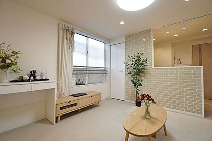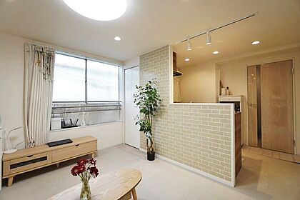 明るく洒落たデザインのリビングは家族の憩いの場です。床材と壁紙のカラーがマッチしています。