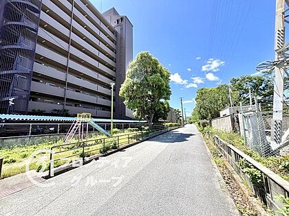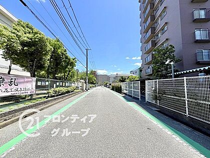 初めてのマイホーム購入にいかがでしょうか。前道の様子です。街に調和するデザインのマンションは、日常の暮らしに安心感をもたらします。