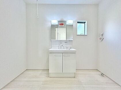 ■□■洗面所■□■便利な三面鏡付き洗面台で身だしなみチェックもバッチリ!備え付けの物干しで雨の日のお洗濯も安心♪洗濯してすぐに干すことができるので運ぶ手間が省けて家事楽です◎