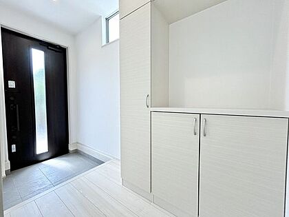 ■□■玄関■□■シックな雰囲気の玄関☆シューズボックスも収納豊富で、中央スリットデザインのドアからの陽射しにより暗くなりがちな玄関も明るくなります♪