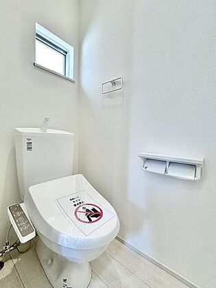 ■□■1階トイレ■□■トイレは温水洗浄便座付きで年中快適にご使用いただけます☆窓から光も入り、換気も簡単に行え清潔感のあるトイレとなっております♪