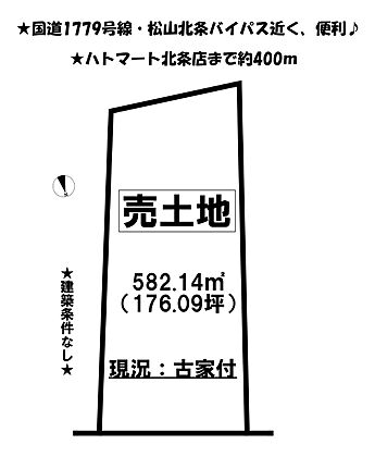 【接道】 一方 ( 公道 北 8m ) ■ハトマート北条店まで約400m■ファミリーマート松山土手内店まで約230m■くすりのレデイ北条店まで約130m■DCMダイキ北条店まで約500m |