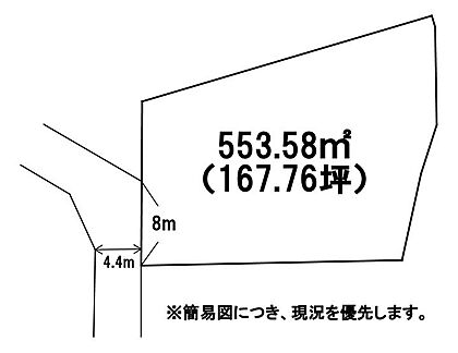 | 土地面積/坪(坪単価) | 553.58m2(登記簿)/167.75坪(3.00万円) | 代表的な接道 | 一方 公道 西 4.4m ※詳細は備考欄をご確認ください |
