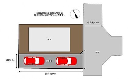 【駐車場】間口約3.5m、手前は横幅約2.5mあります。駐車場の後ろ側は横幅約2.4mに拡張いたしました。
