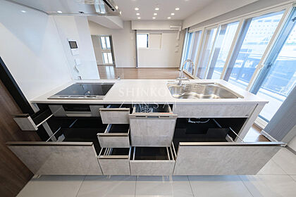 | キッチン | ●IHコンロ ●コンロ三口 ●システムキッチン ●カウンターキッチン ●ディスポーザー |