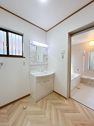 【リフォーム完成】洗面化粧台は新品に交換いたしました。洗面ボウルは洗顔・洗髪はもちろん、つけ置き洗いにも使えます。コンセント付きです。