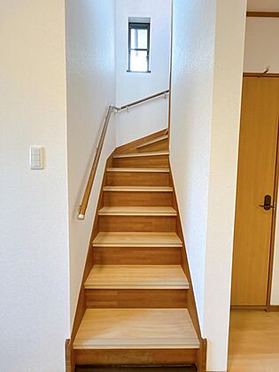 【リフォーム完成】階段のお写真です。踏板はフロアタイルを重ね張りし、壁天井はクロス張替をいたしました。手すり付きですので、お子様からご年配の方まで安心ですね。
