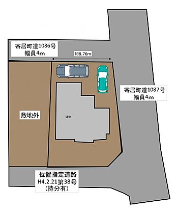 【区画図】接道の幅員は約4mで間口は約8.76mございます。お車は2台駐車できるように拡張いたしました。